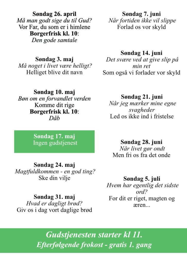 I Borgerkirken kører vi vores gudstjenester omkring temaer. Du kan læse mere om gudstjenester i Borgerkirken under menupunktet “gudstjenester”.