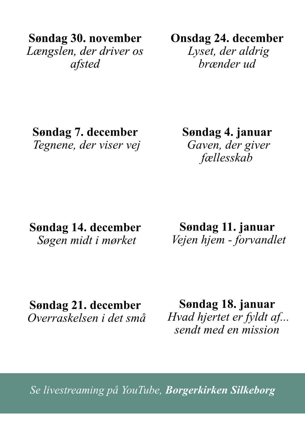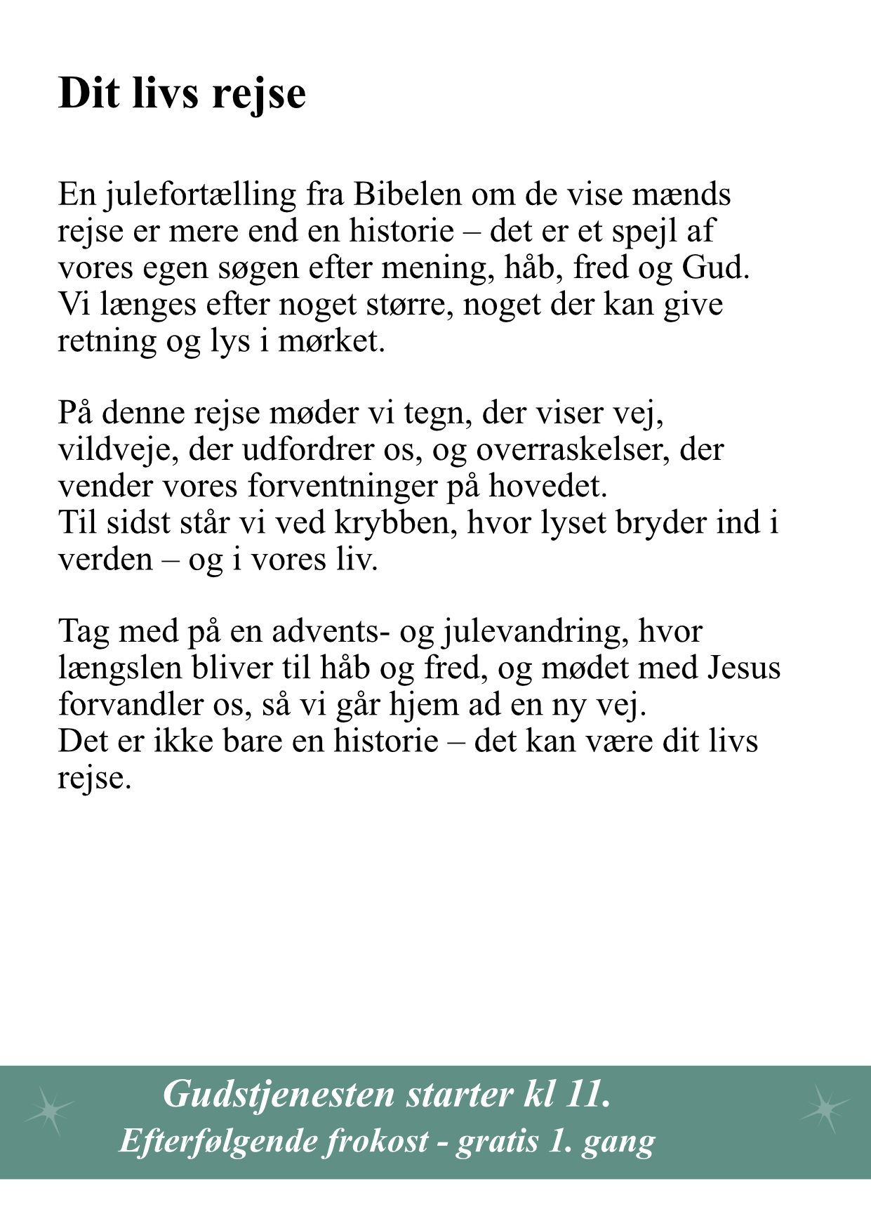 På denne rejse møder vi tegn, der viser vej, vildveje, der udfordrer os, og overrasker, der vender vores forventninger på hovedet. Til sidst står vi ved krybben, hvor lyset bryder ind i verden – og i vores liv.